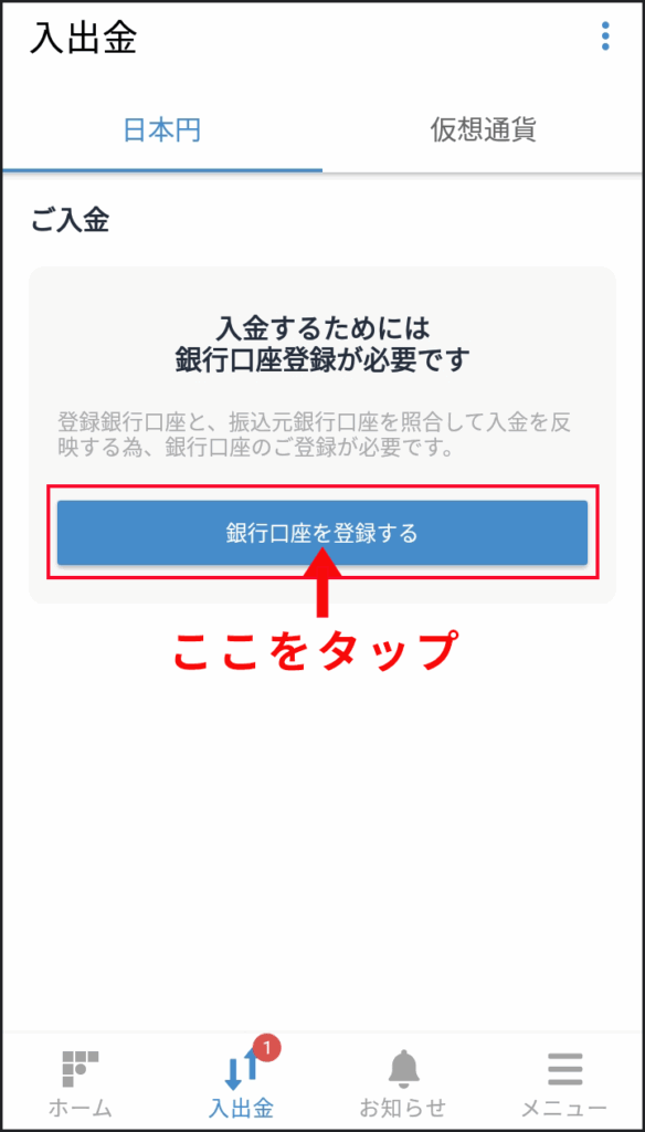 上記の画面が表示されるので、中央の「銀行口座を登録する」ボタンをタップします。
