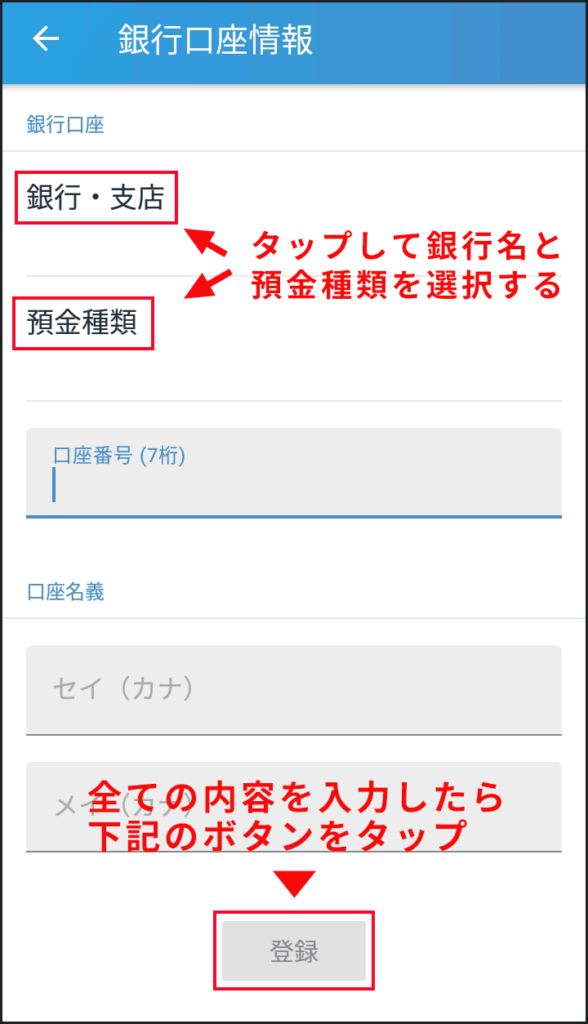 口座番号と口座名を入力したら、画面下の「登録」ボタンをタップします。
