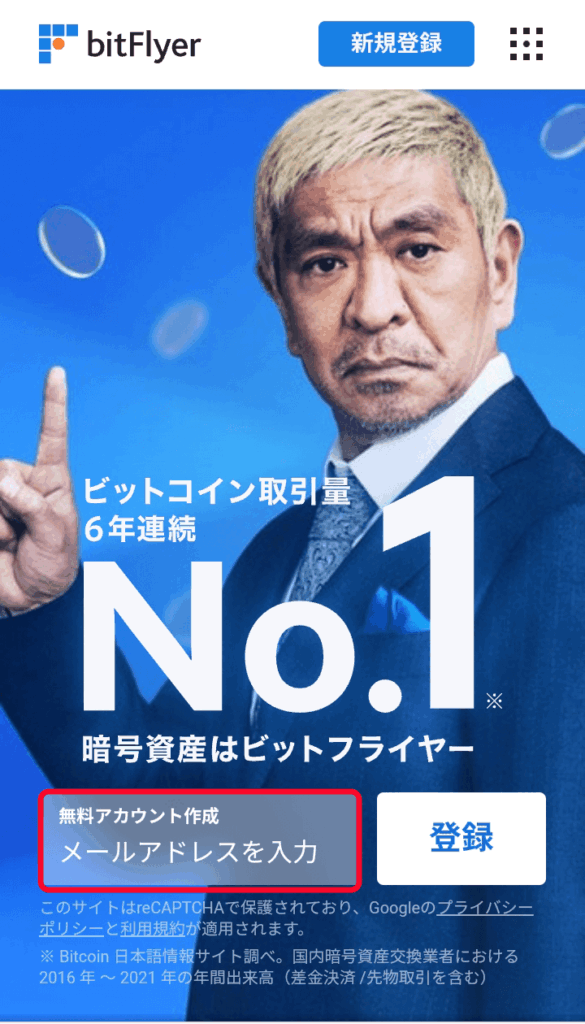 ビットフライヤーの公式ページにアクセスして、画面上の入力欄にメールアドレスを入力して「登録」ボタンをクリックします。