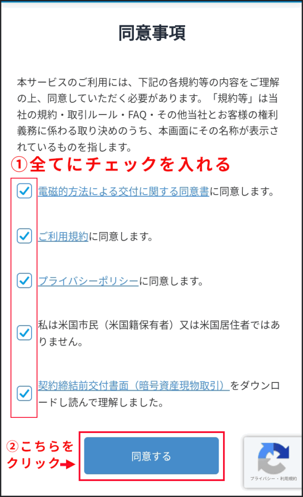 メールアドレスの認証が終わると、同意事項画面に移動します。全てのボックスにチェックを入れて「同意する」ボタンをタップします。