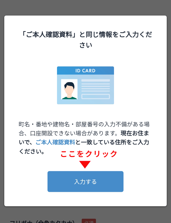 本人確認で使う資料の情報が、現住所と一致するか確認して、問題なければ「入力する」ボタンをタップします。