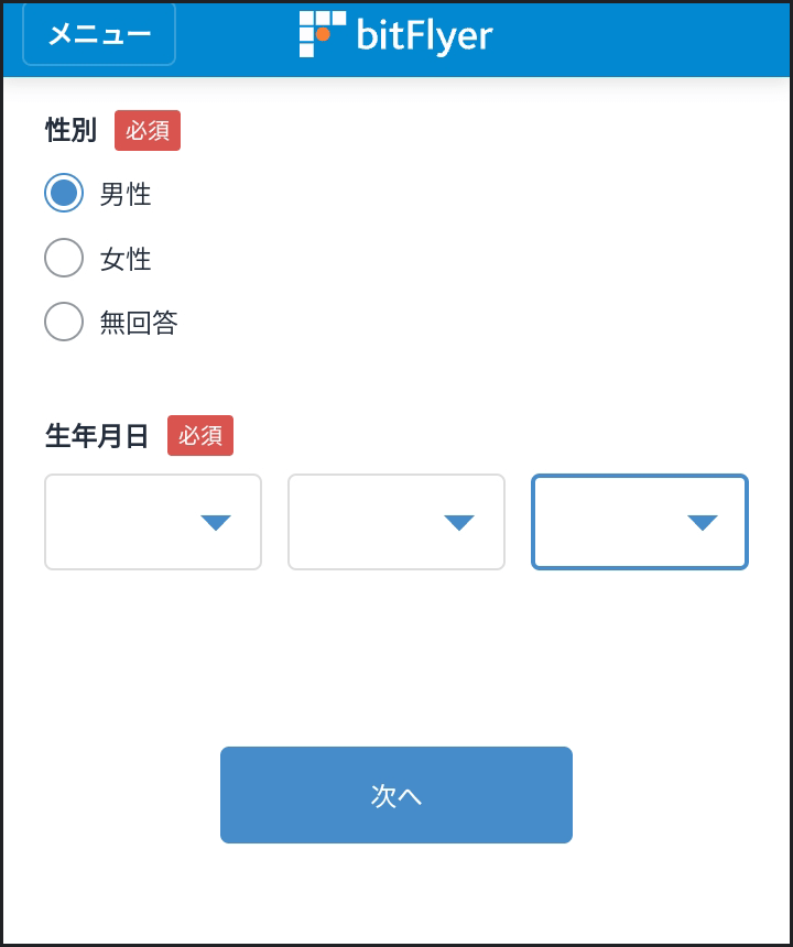 BitFlyerの存在を知った経緯をドロップダウンメニューから選択します。そのあと「次へ」ボタンをクリックします。
