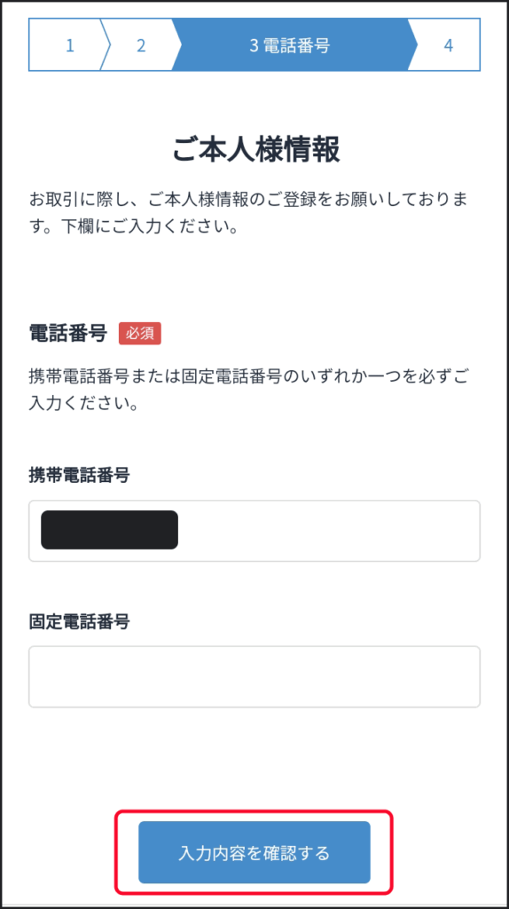 入力欄に電話番号を入力して「入力内容を確認する」ボタンをクリックします。