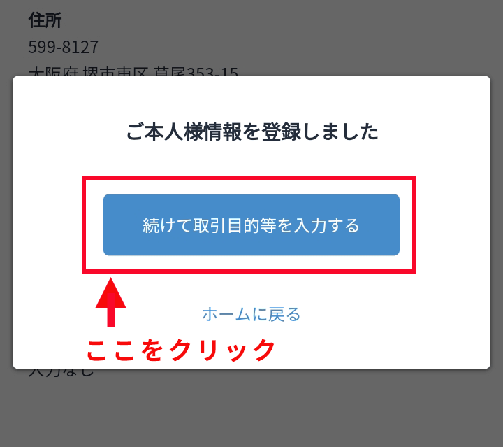 「続けて取引目的等を入力する」ボタンを押して設定を進めていきましょう。