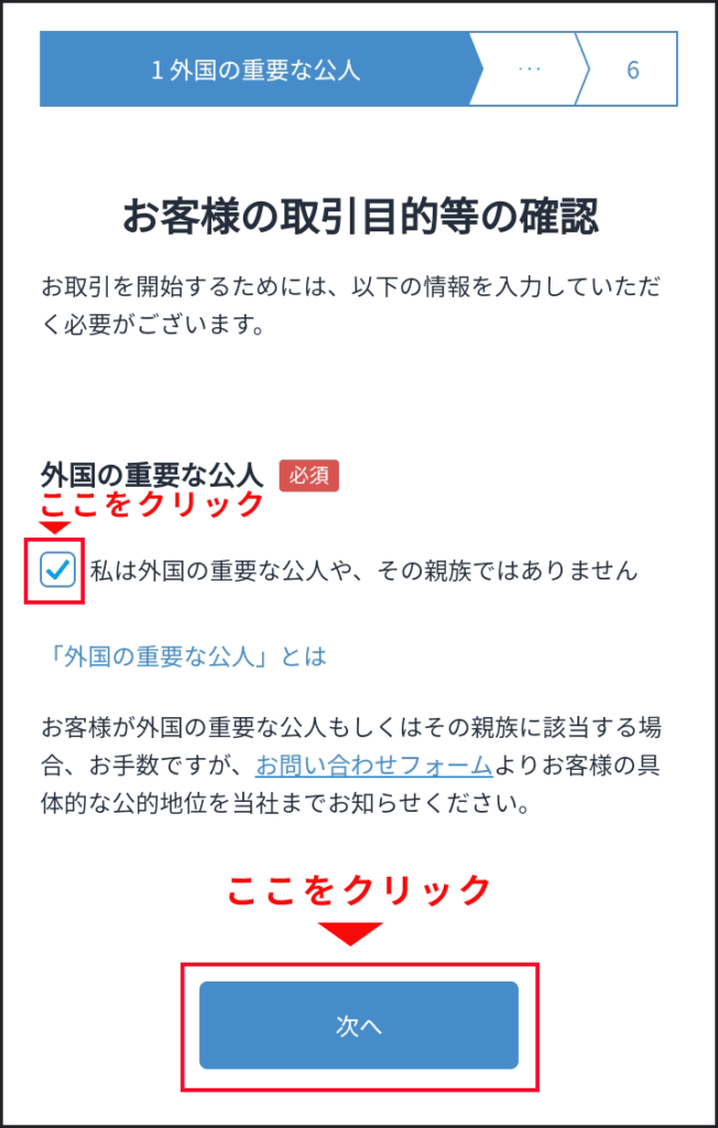 「私は外国の重要な公人や、その親族ではありません」のチェックボックスをタップして「次へ」ボタンをタップします。