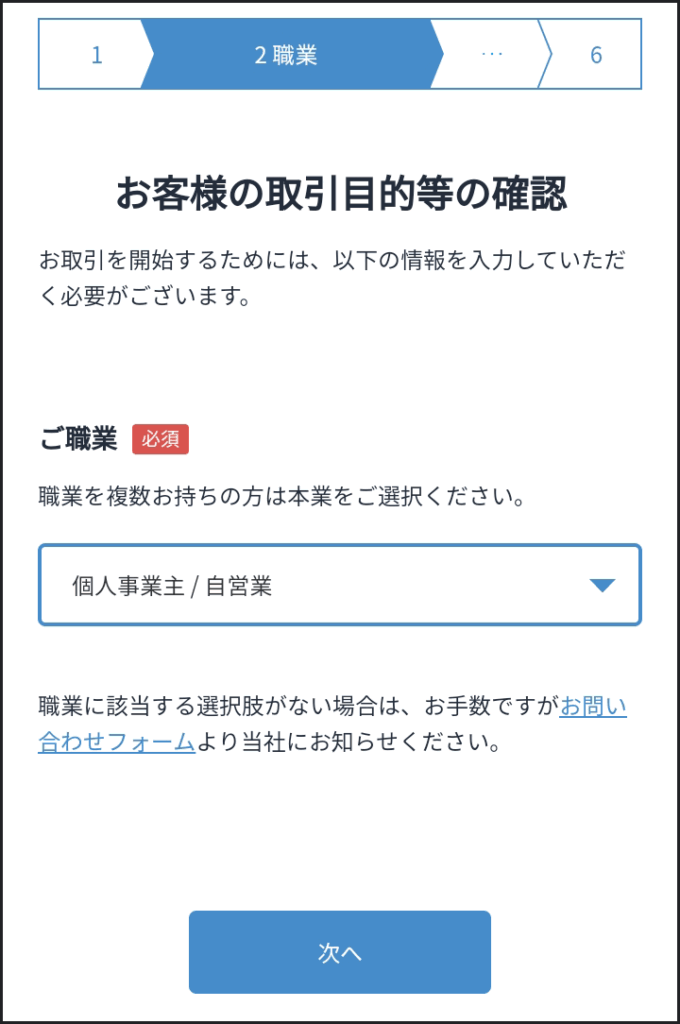 ドロップダウンメニューをタップして、自分の職業を選び「次へ」ボタンをタップする。