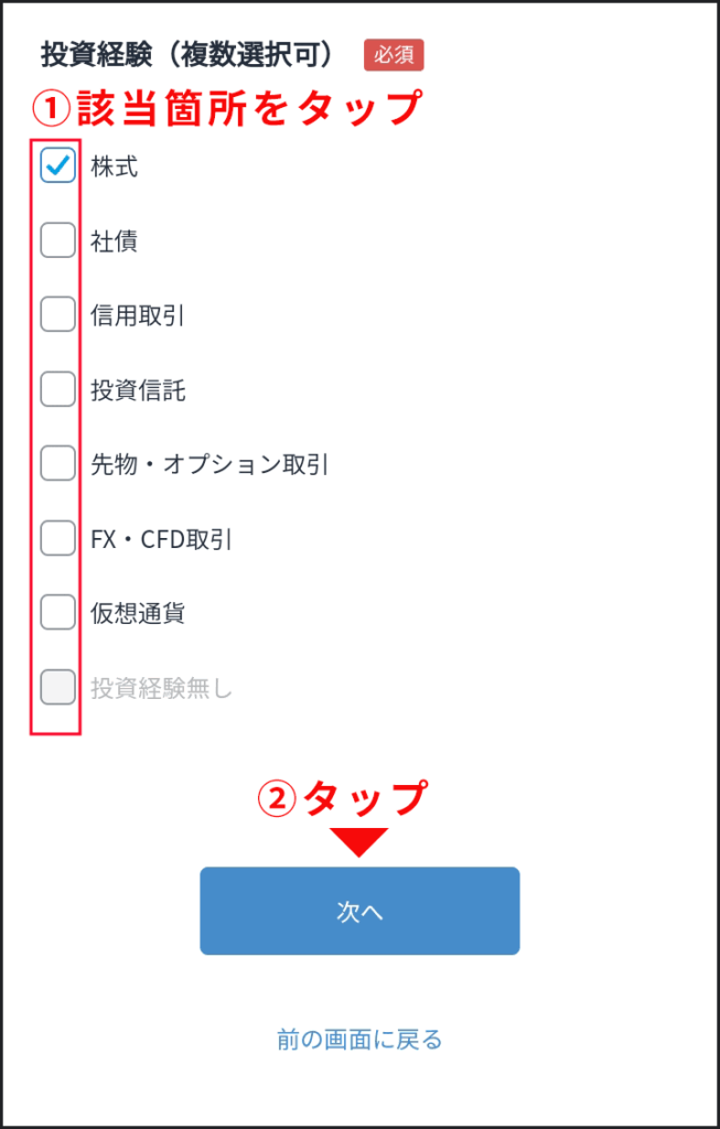 ・投資経験入力したら「次へ」ボタンをタップします。