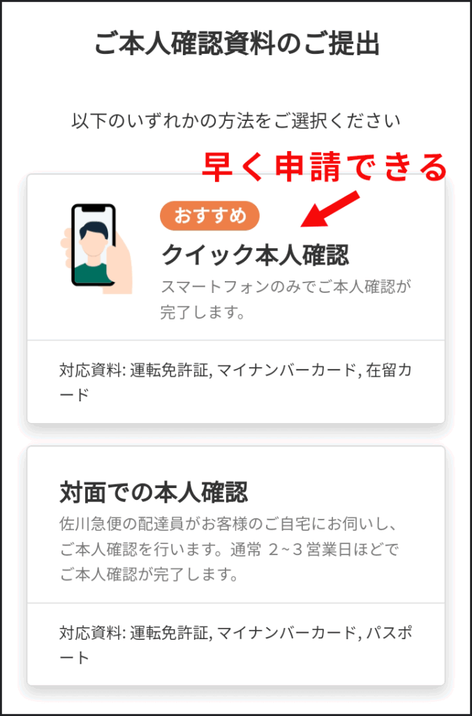 確認書類とスマホさえあればその場で提出できる「クイック本人確認」がおすすめです。
