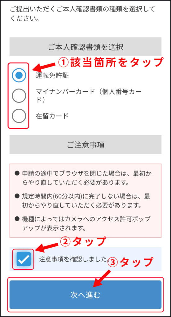 提出できる確認書類の右横にある丸いボックスをタップ。注意事項のチェックボックスもタップして「次へ進む」をタップします。