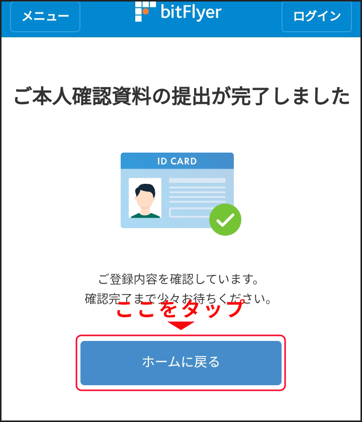 下記の画面が表示されたら無事完了です。「ホームへ戻る」ボタンをタップして、次はBitFlyerのアプリをインストールします。