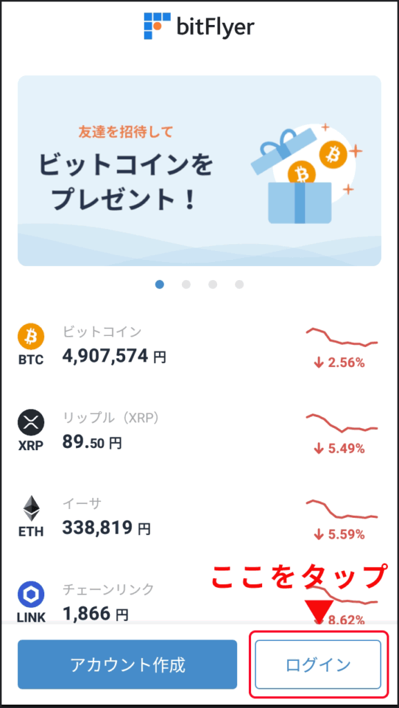 インストールが完了してアプリを開くと、画面下に「ログイン」ボタンが表示されるのでそこをタップします。