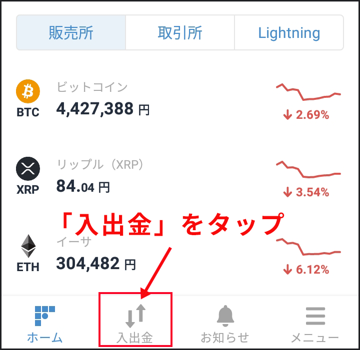 bitFlyerにログインし、画面下のメニューアイコンから「入出金」をタップします。