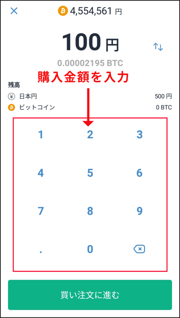 - STEP3購入したい金額を入力して「買い注文に進む」ボタンをタップ