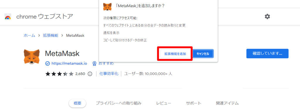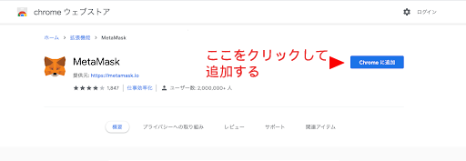 上記のようにキツネのようなアイコンがメタマスクの特徴です。「Chromeに追加」ボタンを押します。
