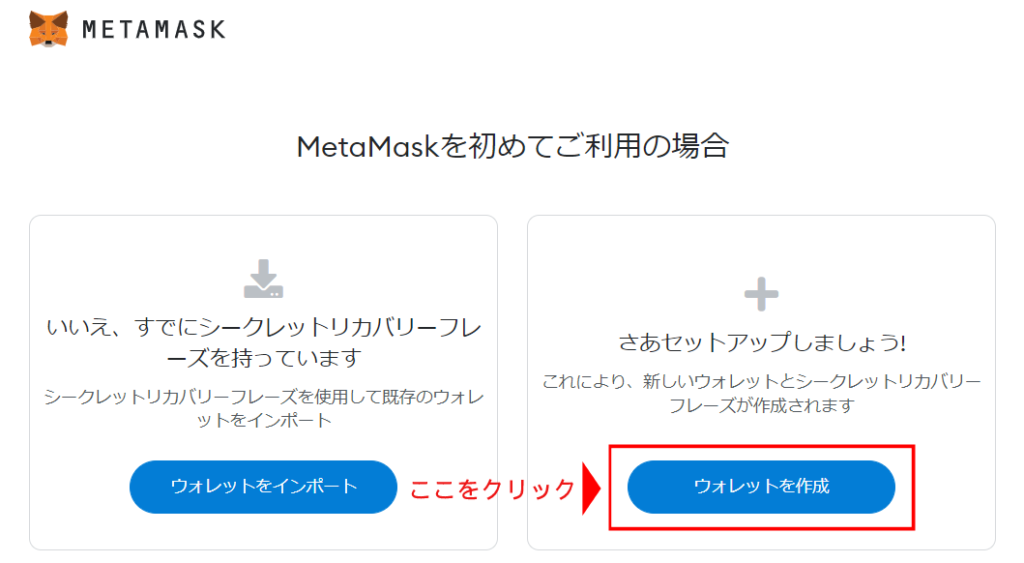 以前メタマスクを作ったことがある場合は、画面左の「ウォレットをインポート」から復元するという仕組みです。