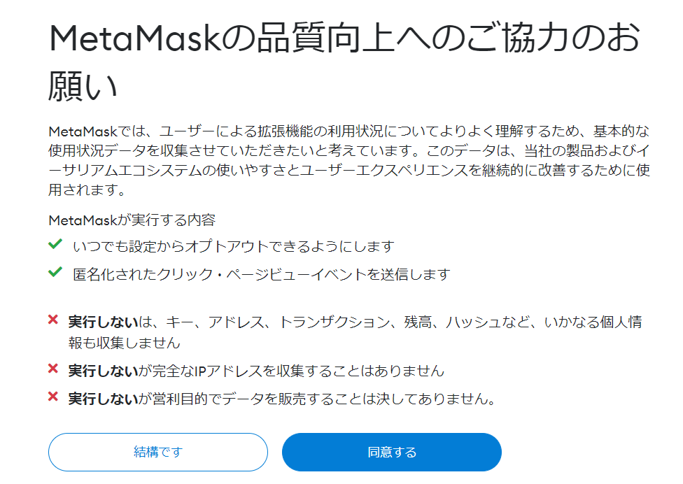 上記の画面はMetamaskの品質向上に協力するかどうかの選択なので、どちらのボタンを押しても問題ありません。