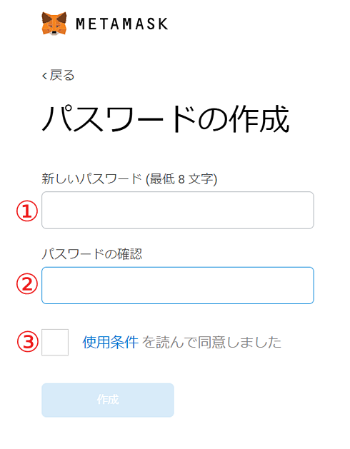 任意のパスワードを入力したあと、③のチェックボックスをクリックして「作成」ボタンをクリックしましょう。