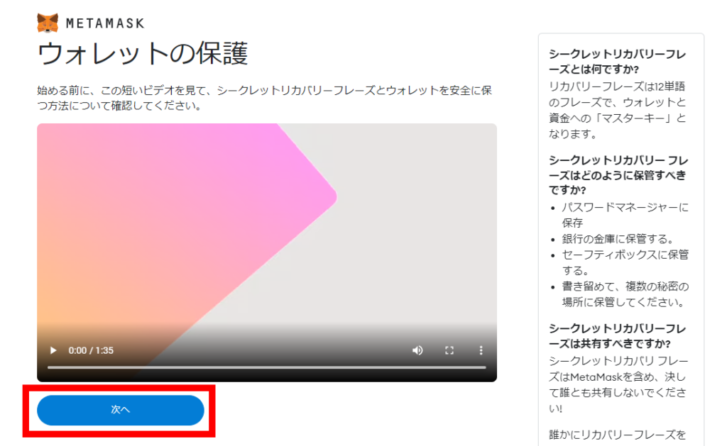 上記の画面は、メタマスクを使用する際に利用する「シークレットリカバリーフレーズ」の注意事項について説明しています。