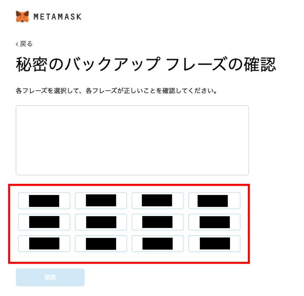 画面上にある入力欄へ、自分のシークレットリカバリーフレーズを順番通り入力します。